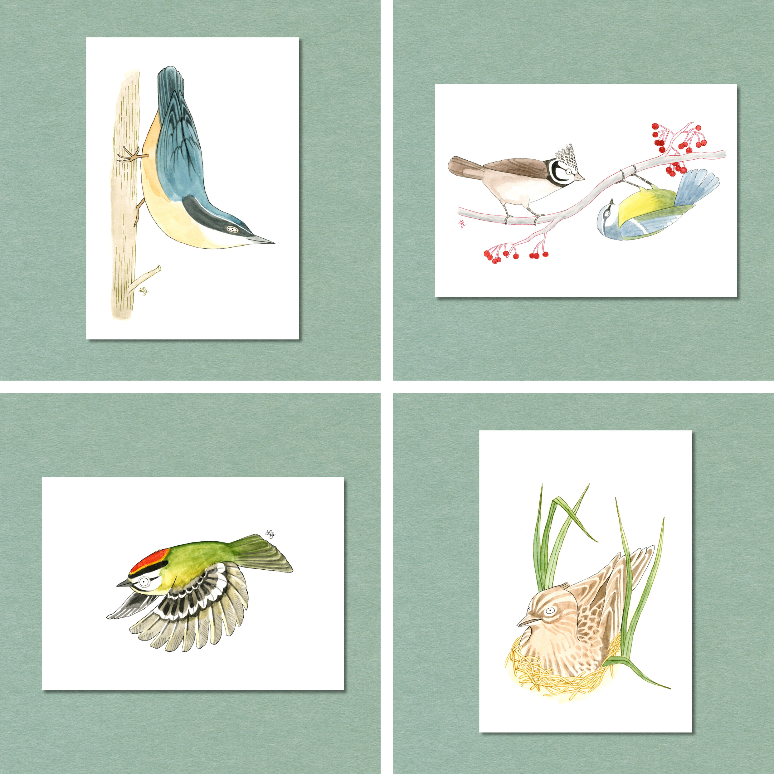 The secound special edition of European songbird cards include the nuthatch, crested tit & blue tit, common firecrest, and skylark.